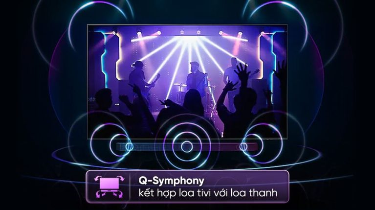 Tivi có tính năng Q-Symphony đồng bộ loa tivi với loa thanh Samsung, mang lại hiệu ứng cộng hưởng mạnh mẽ và âm thanh lan tỏa khắp không gian.