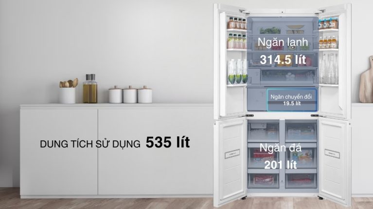 Với dung tích sử dụng 535 lít, sản phẩm đáp ứng tốt nhu cầu lưu trữ thực phẩm cho gia đình 4 – 5 người, hoặc những gia đình ít thành viên nhưng có thói quen trữ nhiều thực phẩm.