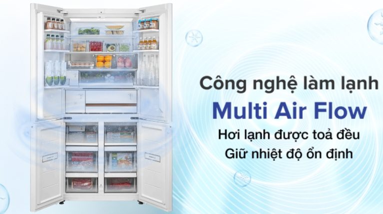 Multi Air Flow – công nghệ làm lạnh đa chiều giúp luồng khí lạnh lan tỏa đồng đều khắp các ngăn, đảm bảo thực phẩm được làm lạnh nhanh và bảo quản tối ưu.