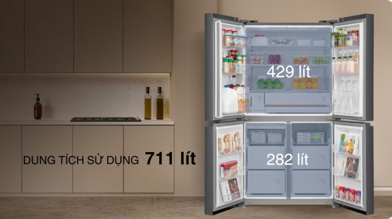 Dung tích sử dụng lớn 711 lít, đáp ứng tốt nhu cầu bảo quản thực phẩm cho gia đình đông người (trên 5 thành viên) hoặc trữ thực phẩm số lượng lớn.
