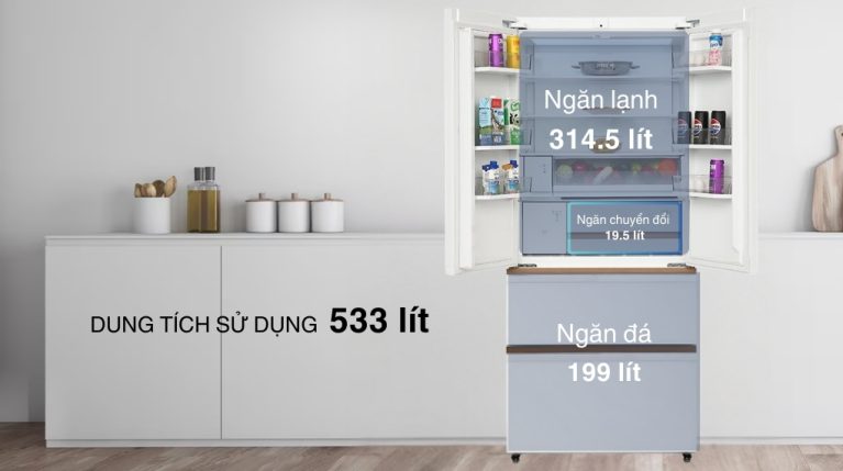– Dung tích sử dụng 533 lít, phù hợp với những gia đình từ 4 – 5 thành viên hoặc những gia đình ít người hơn nhưng có nhu cầu lưu trữ thực phẩm cao.